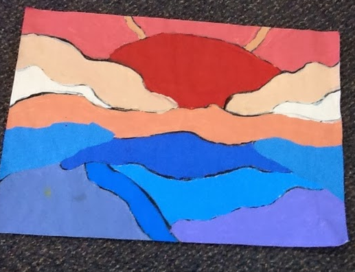 The lines in my art are around my sun and my sunshine. Around my mountains and my hills. They are effective because they make the shapes stand out. The colours are on my whole painting. They are effective because it makes the painting look interesting. the tone is in my sunshine. It is effective because it shows the suns rays. The simple shapes are in my mountains and my hills. They are effective because you can still tell what they are. Overall my painting is very good because I have tone, simple shapes, bold lines, and nice colours.